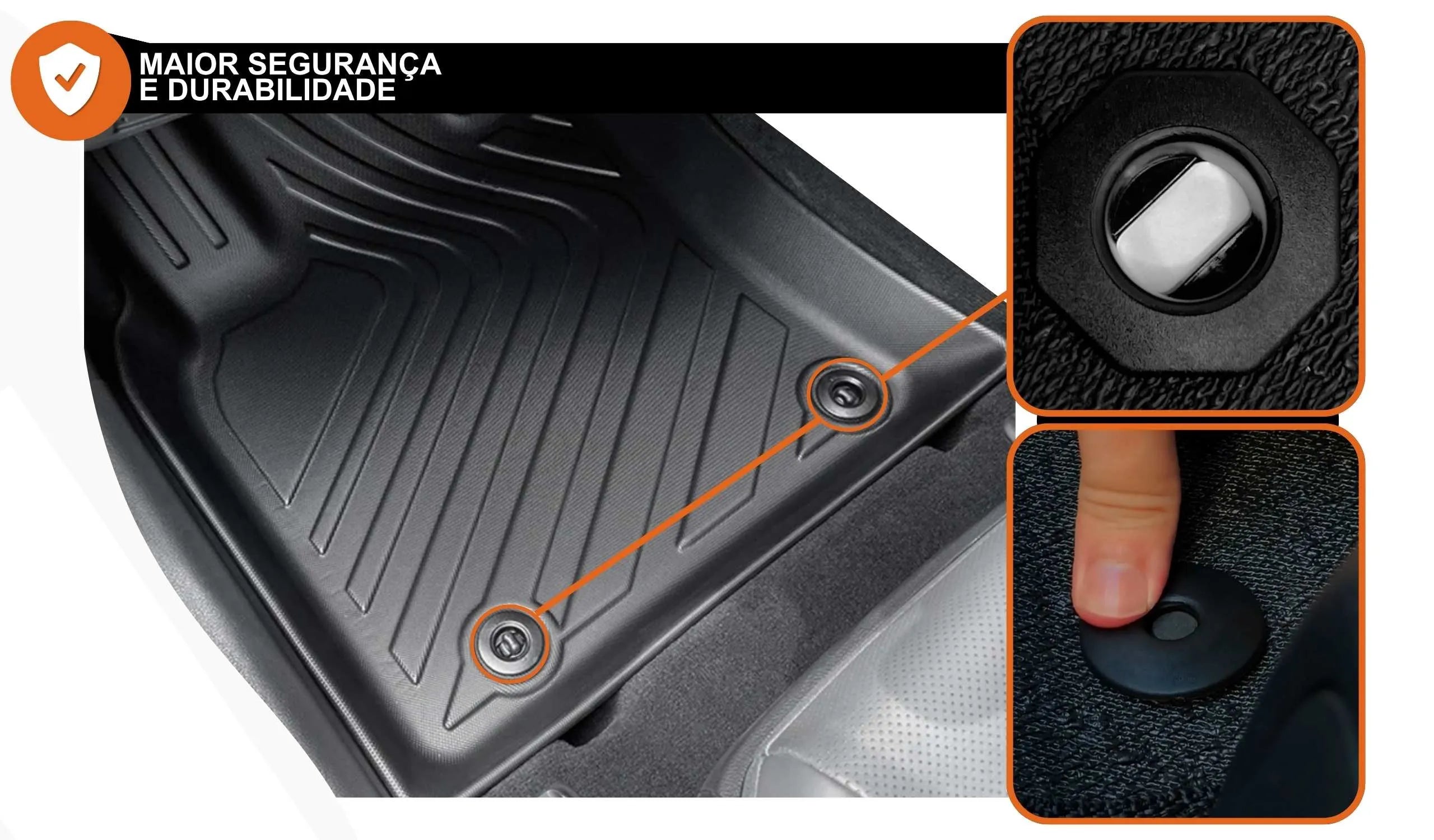 Garantia de instalação segura e estável! Nossos tapetes automotivos contam com ilhós de alta qualidade, evitando deslizamentos e proporcionando mais durabilidade. Escolha a segurança e o padrão original para seu veículo.